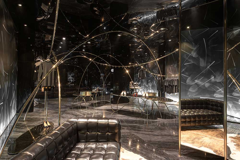 材料并非手段,可理解為達(dá)成的通道。商業(yè)攝影的介入讓羽毛圖形得以在透光軟膜上漾開,配合暗藏的燈光,制造引力反轉(zhuǎn)效果;兩種規(guī)格香檳金的鐵管,一為起點(diǎn)一為終點(diǎn),如白描的線條在空中隨性;黑色鏡面軟膜天花產(chǎn)生的屈光效果,把空間里的物品鏡化出了水墨畫的感覺。西方材料的東方表達(dá),是本案在材料運(yùn)用的主張。