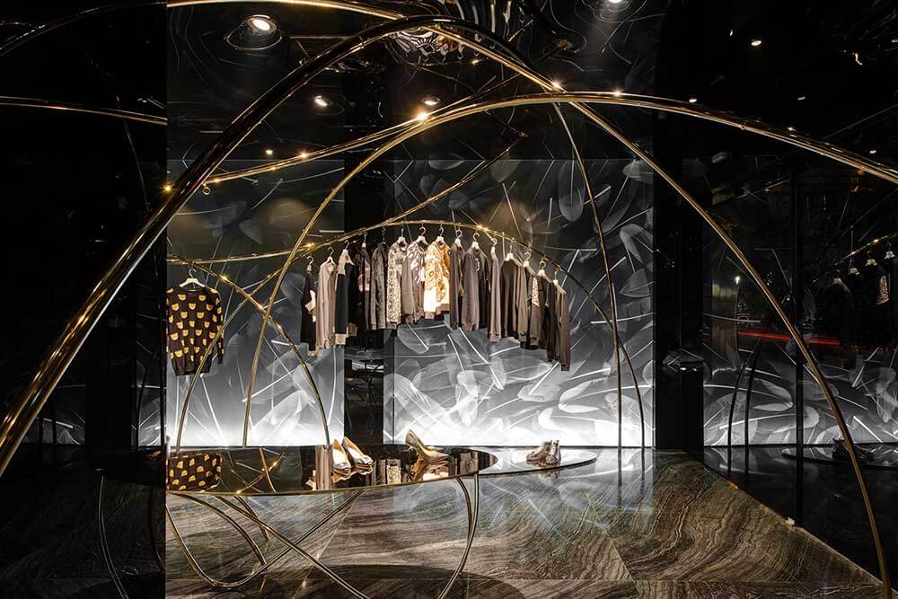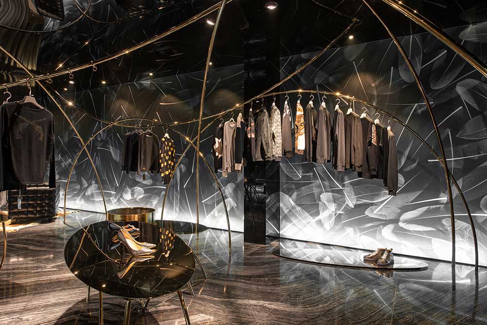 海淘如鴻雁傳書,聯(lián)想到鳥,于是便將主題定為飛翔的軌跡。曲線是四面而來的,無定向串聯(lián)起懸掛其中的服飾。燈光是運(yùn)動(dòng)的,在服裝上騰挪,形成動(dòng)態(tài)的耀眼光斑。我們將雕塑藝術(shù)引入道具設(shè)計(jì),讓所謂潮流不停流于表像層面。流行也好,時(shí)尚也罷,并無定勢(shì)如曇花一現(xiàn)。單純從三維考慮空間,難免被禁錮,這一次,我們嘗試用靜態(tài)詮釋動(dòng)態(tài),若深層解讀,記錄的是時(shí)間。